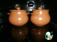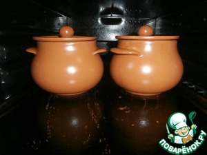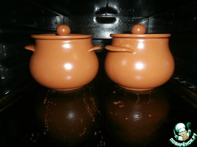 Готовую кашу выкладываю в порционные горшочки, на неё кладу обжаренные с луком и морковью грибы, разравниваю верх |