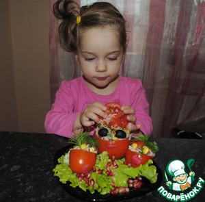 Готовую семью кладем на зеленый лист салата и украшаем гранатом. Для создания глаз я использовала кукурузу и маслины, а рот сделала из редиса.