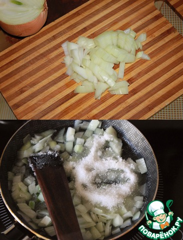 Лук нарезать квадратиками примерно 1х1 см. На сковороде разогреть масло, сделать огонь максимальным и всыпать лук, и сразу же - сахар, и быстро перемешать