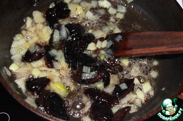 Как только лук начнет карамелизироваться, огонь уменьшить и тушить лук до прозрачности, постоянно помешивая - это займёт примерно 10 минут. Добавить чернослив и потушить ещё примерно 2-3 минуты