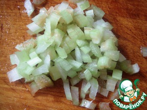 Мелко режем стебель сельдерея, добавляем к помидорам с огурцом