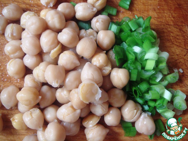 Нарезаем 3 пера зеленого лука, добавляем нут и лук к остальным овощам