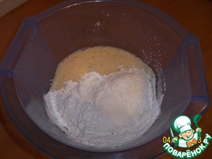 • Затем добавляем муку, крахмал и разрыхлитель теста. Все хорошо перемешать.