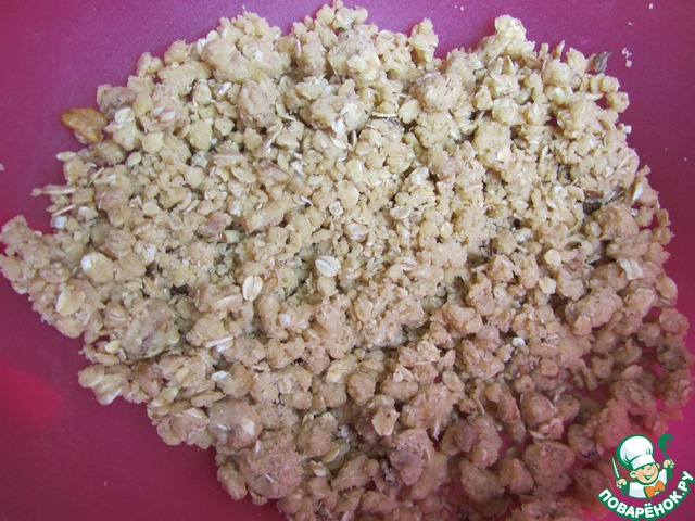 Смешать овсяные хлопья, муку, сахар, соль, дробленые грецкие орехи-все перемешать. Добавить размягченное сливочное масло и замесить тесто в крошку!