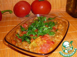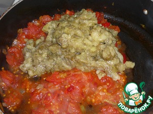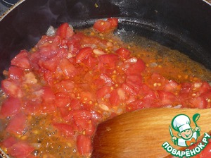 Режем лук, поджариваем его на масле, добавляем помидор и оставляем тушиться на минут 10.