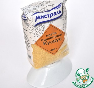 Кускус залить небольшим количеством кипяченой воды. Накрыть плотно крышкой, дать набухнуть минут 5-7.
