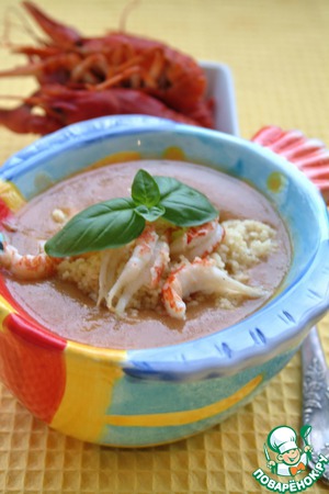 В тарелку налить суп-пюре, положить две-три столовые ложки кускуса, сверху очищенные раковые шейки, украсить зеленью.