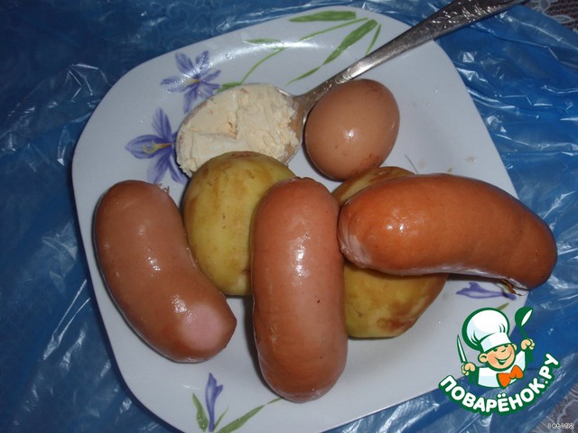 • Взять сосиски, картошку, лук, яйцо, майонез (сметану).