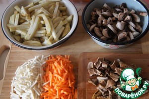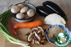 Грибы нарезать кусочками. Оставшуюся морковку и сельдерей нарезать соломкой. Баклажаны и картофель очистить. Нарезать брусочками. Шампиньоны очистить и нарезать ломтиками. Острый перец вымыть, удалить сердцевину и нашинковать колечками.