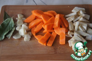 Лук, чеснок, морковь и сельдерей очистить. Половину морковки, половину сельдерея и чеснок нарезать ломтиками. Луковицу надрезать крест-накрест.