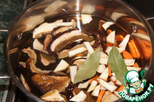 Сухие грибы тщательно промыть водой, положить в кастрюлю, добавить луковицу, морковку, сельдерей, чеснок, лавровый лист, влить 2 л воды, довести до кипения и на слабом огне варить 20 минут. Бульон процедить, грибы выбрать, овощи выкинуть.
