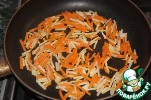 Тем временем в освободившуюся сковороду добавить ложку масла и обжарить морковь и сельдерей 5 минут,