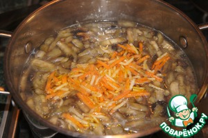 В кипящий бульон засыпать белые грибы и картофель, варить 5 минут. Выложить шампиньоны с баклажанами, посолить и поставить вариться на маленьком огне 10 минут.