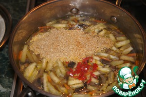 И сразу же добавить зажарку в суп. В общей сложности все должно вариться 10 минут: 5 минут грибы с баклажанами плюс зажарка и еще 5 минут, всего 10 минут. Туда же добавить острый перец.