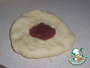 Отрываем шарики. Приплюснув их, кладём джем. Залепив края, кладём швом вниз в смазанную сливочным маслом форму.