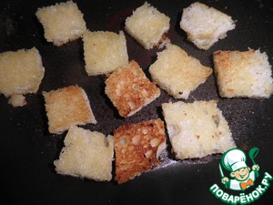 Хлеб нарезаем на кубики 1,5*1,5 и обжариаем с двух сторон на сливочном масле