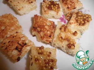 Смазываем половину хлебных квадратиков горчицей и накрываем вторыми половинками.
