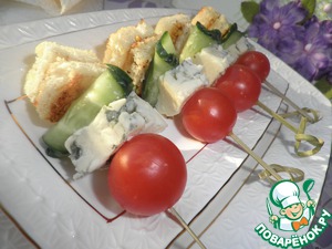 Сыр нарезаем на кубки, Огурец тонкими кружочками. Теперь нанизываем ингредиенты в следующей последовательности :черри, сыр, огурец и хлеб.