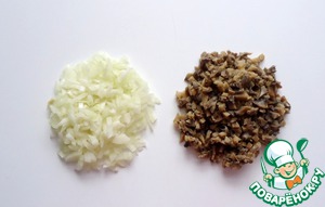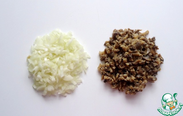 Пока варится фасоль, мелко нарезаем лук и грибы.