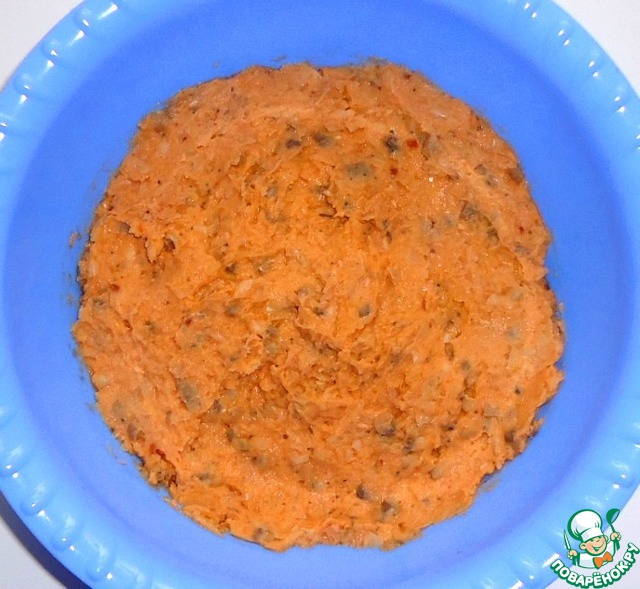 Из фасоли приготовить пюре. Вареную фасоль остудить, пропустить через мясорубку или измельчить с помощью блендера.