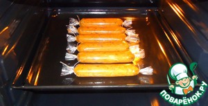 Духовку разогреть до 200 градусов, сосиски выложить на противень и выпекать 10 минут.