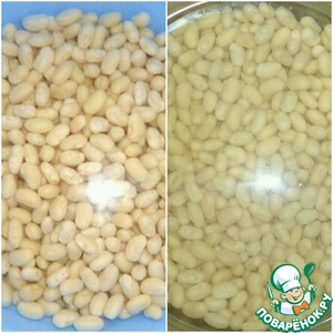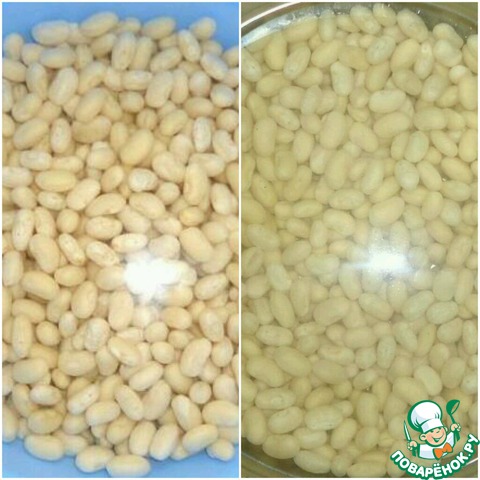 Фасоль замочить на 4-5 часов, лучше замачивать на ночь, затем обязательно сменить воду и отварить до готовности без добавления соли. Фасоль варится больше часа.