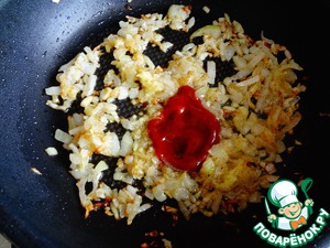 Разогреть в сковороде растительное масло (лучше рапсовое), и пожарить сначала лук, потом добавить к нему чеснок, имбирь и специи.