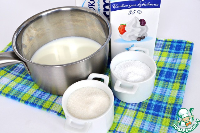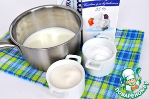 • В кастрюлю наливаю молоко и нагреваю примерно до 85 градусов на медленном огне. В молоко добавляю сахар и фруктозу, размешиваю до полного растворения. Затем добавляю сливки и охлаждаю молочную смесь до 30 градусов.