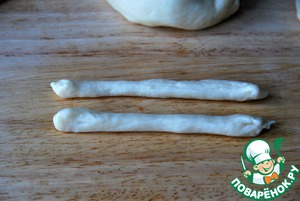 От теста отщипываем небольшие кусочки и раскатываем тонкие жгутики длиною около 10 см. У меня не было проблем, тесто очень элластично, не липло.