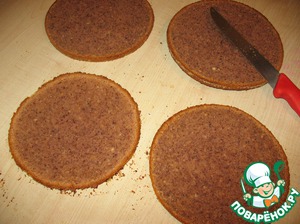 Достаём из духовки и даём остыть. Затем разрезаем на коржи - у меня получилось четыре.