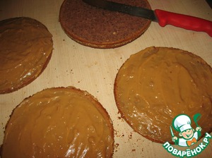 Все подготовленные коржи смазываем нашим кремом. Также смазываем бока торта.