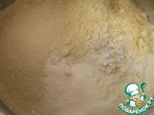 Соединить все сухие ингредиенты: ореховую муку с сахаром, разрыхлитель, ванилин и обычную муку, перемешать.