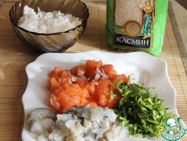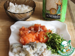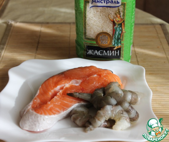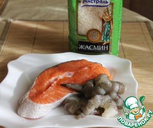 Нам понадобится лосось, креветки, рис, оливковое масло