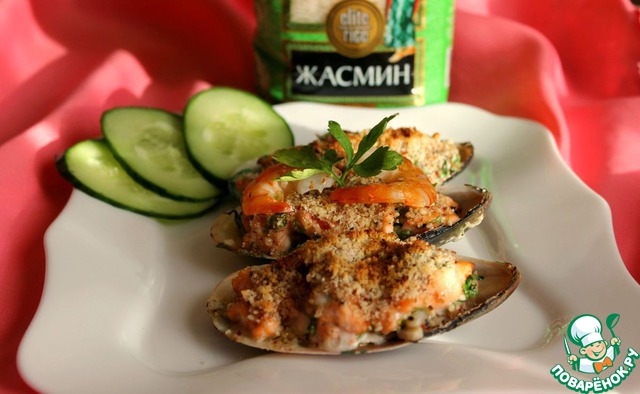 Мелко режем лосось, креветки, петрушку, чеснок, смешиваем с отваренным рисом, солим, перчим, приправляем оливковым маслом и вымешиваем фарш