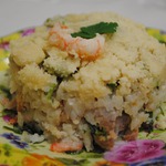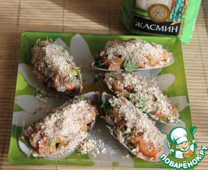 Фарш из рыбы и риса раскладываем по формочкам, можно сделать как я и разложить его в ракушки из-под крупных мидий, посыпать молотым миндалем, сбрызнуть оливковым маслом