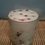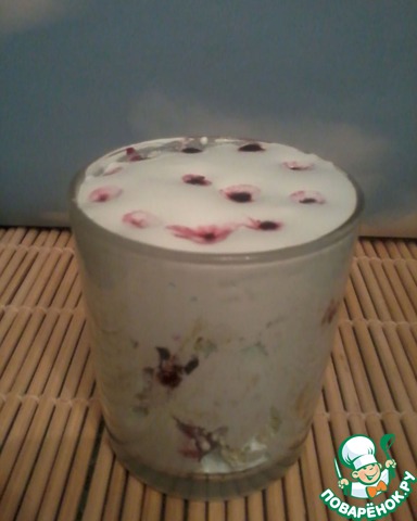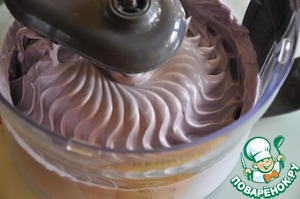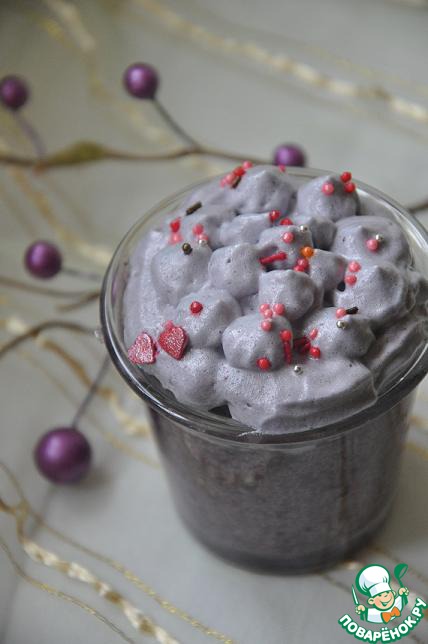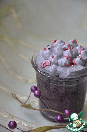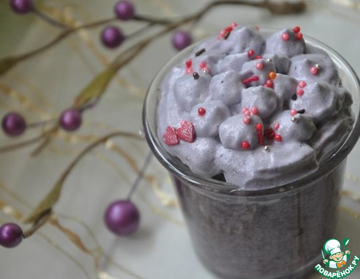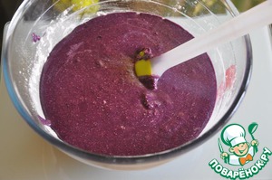 Взбиваем 2 белка. Не переставая взбивать, всыпаем по 1 ч. л 50 г сахарной пудры. Когда получилась крепкая пена, постепенно добавляем сок черники.