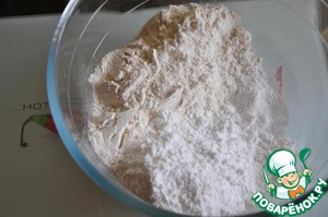 Отдельно хорошо перемешиваем 100г сахарной пудры, муку, разрыхлитель и соль.