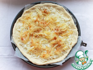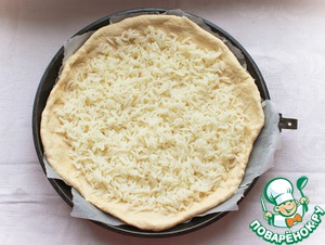 На лепёшку из теста выкладываем половину отваренного риса. -