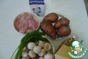 Картофель почистить и сварить. Слить всю воду, помять, добавить масло 100 г и 100 г сливок. Грибы порезать и обжарить на масле и посолить. Положить на тарелку.