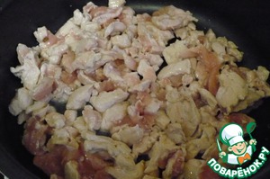 Грудки сполоснуть и порезать тонкими полосками. Обжарить и посолить, убрать со сковороды.