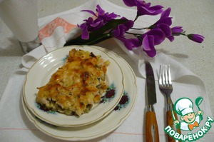 Форму смазать раст. маслом и обсыпать белыми сухарями. Теперь собираем нашу запеканку : картофельное пюре, грибы, укроп.