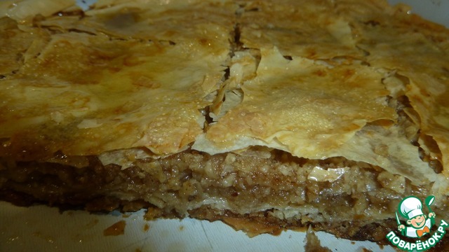 Повторяем предыдущие действия ещё 2 раза (3 листа теста + орехи + 3 листа теста + орехи). Края теста можно загибать, на ваше усмотрение, либо заранее обрезать по форме вашего противня.