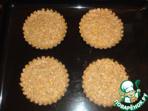 Формочки смазать растительным маслом. Тонким слоем распределить тесто руками по формочкам.