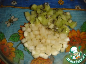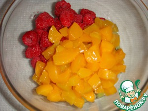 Для соуса с фруктов сцедить маринад в кастрюльку, добавить 2 ч. л. меда, дать закипеть, добавить разведенный крахмал и проварить несколько секунд до загустения.