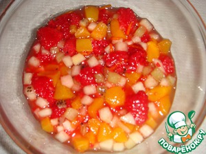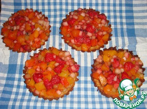 Фрукты и ягоды залить маринадом, перемешать и оставить до готовности корзиночек.