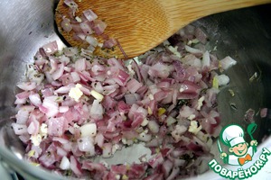 • В небольшой кастрюле с толстым дном нагреваем оливковое масло, кладем туда лук и обжериваем помешивая 2-3 минуты.