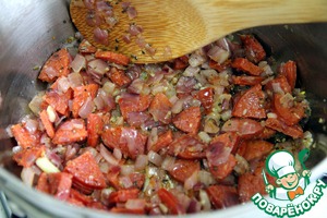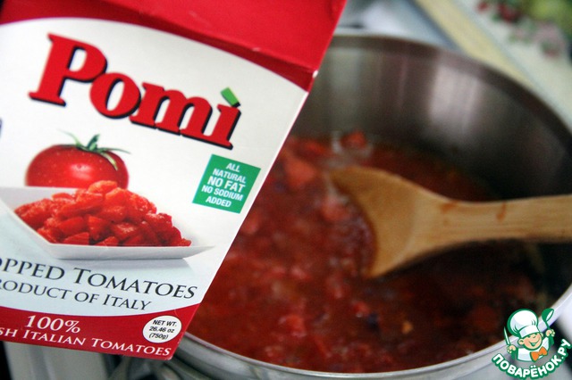 • Затем кладем помидоры, томатную пасту, перец, сахар, бульон, вустерский соус доводим до кипения и готовим около 20 минут.