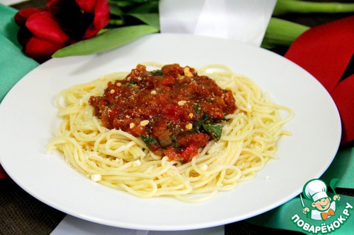 • При подаче положить соус сверху спагетти и посыпать пармезаном.