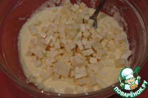 Масло нарезать маленькими кубиками, добавить к муке и растереть руками до состояния однородной крошки.