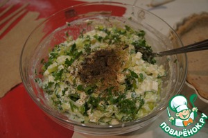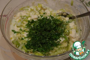 Припустить порей в оливковом масле, остудить. Брынзу нарезать маленькими кубиками.